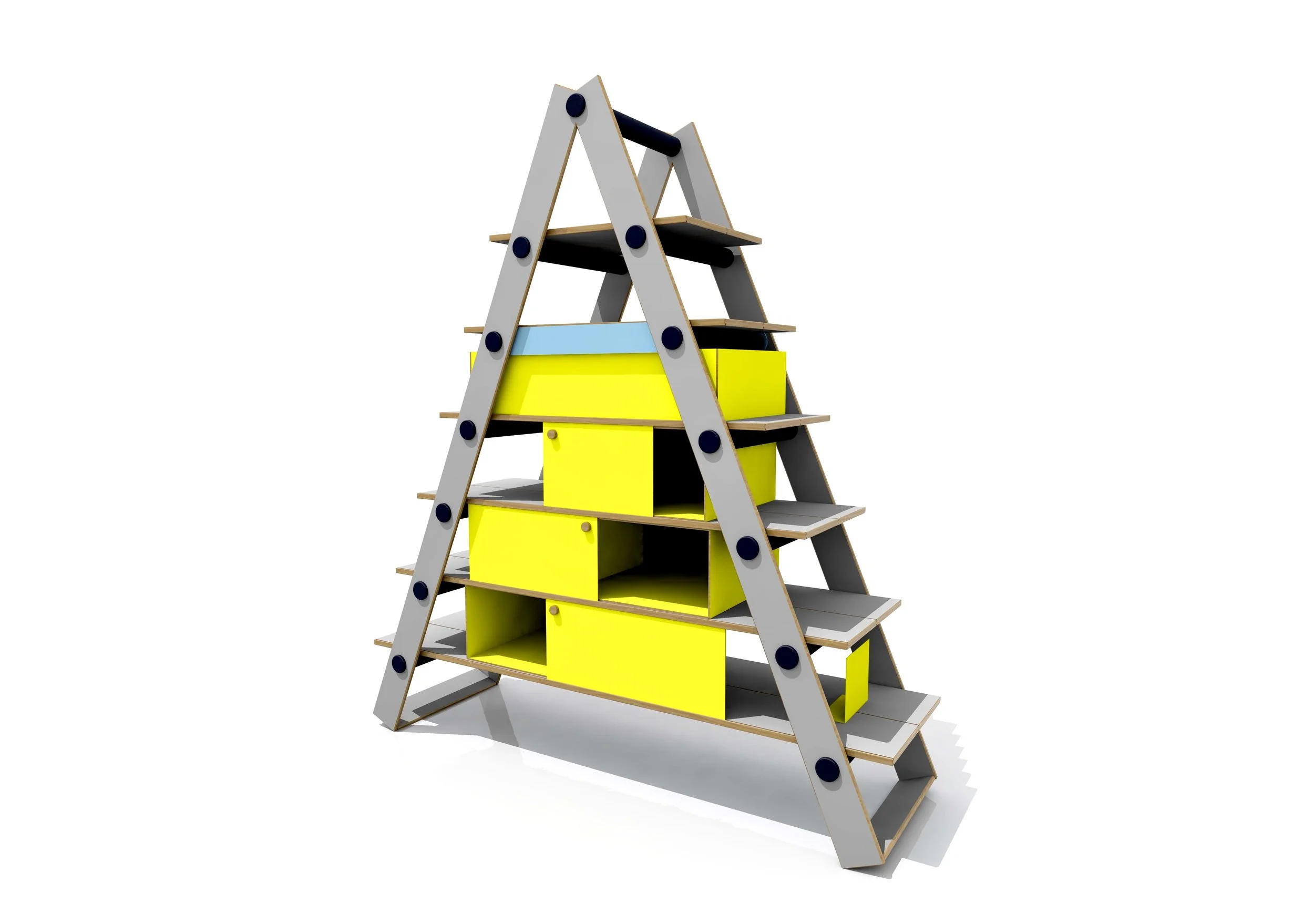 Der Entwurf des Leiter Regals vereint die Funktionen eines Schranks und eines Regals in einem flexiblen Möbelstück. Die integrierten Einsätze können auf einer Leiste verschoben werden, während die Schiebetüren den Zugang zum Inhalt erleichtern.